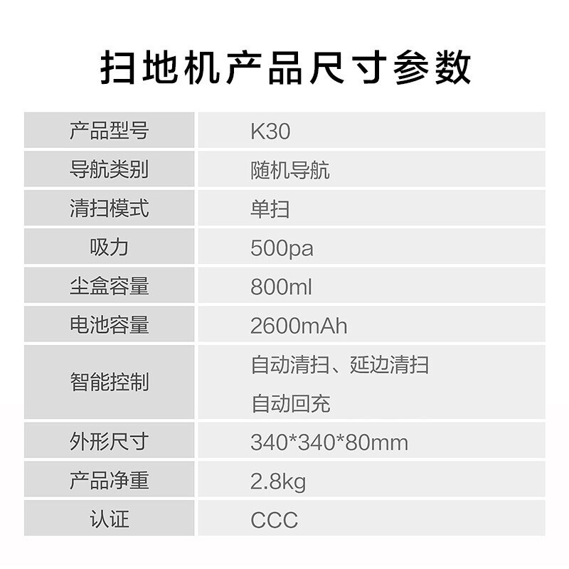 商品相册:美的(Midea)K30 扫地机器人 家用大吸力全自动智能吸尘器 扫地机 自动回充 纤薄机身第