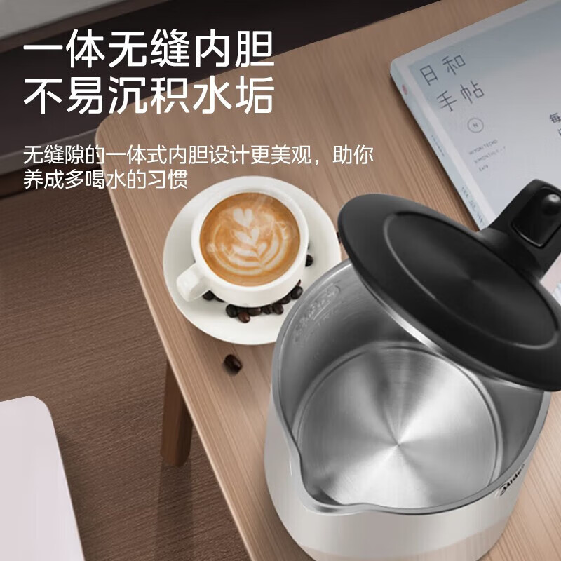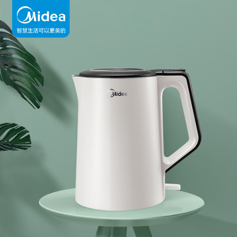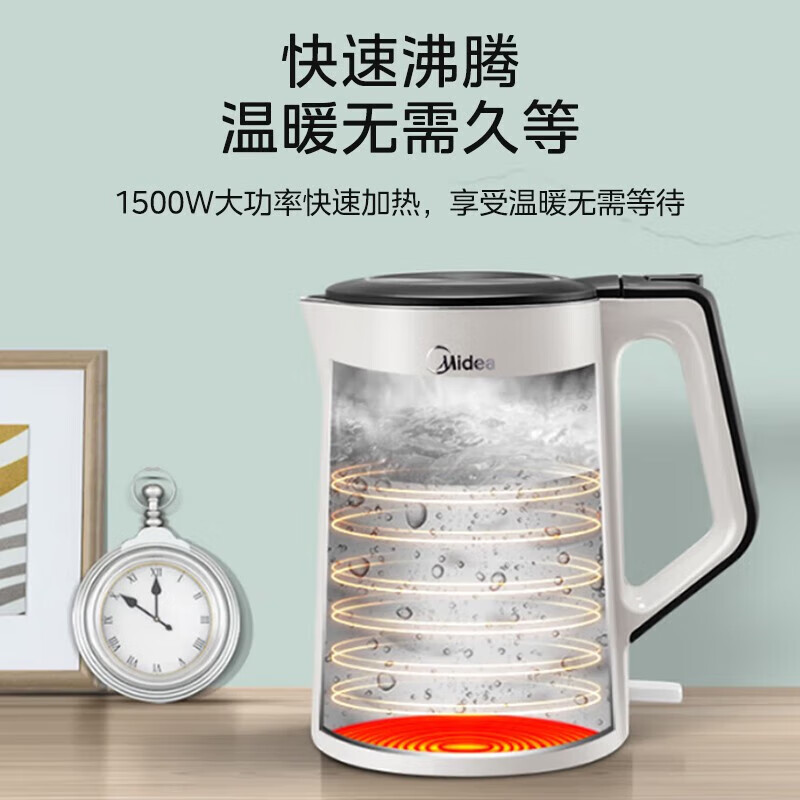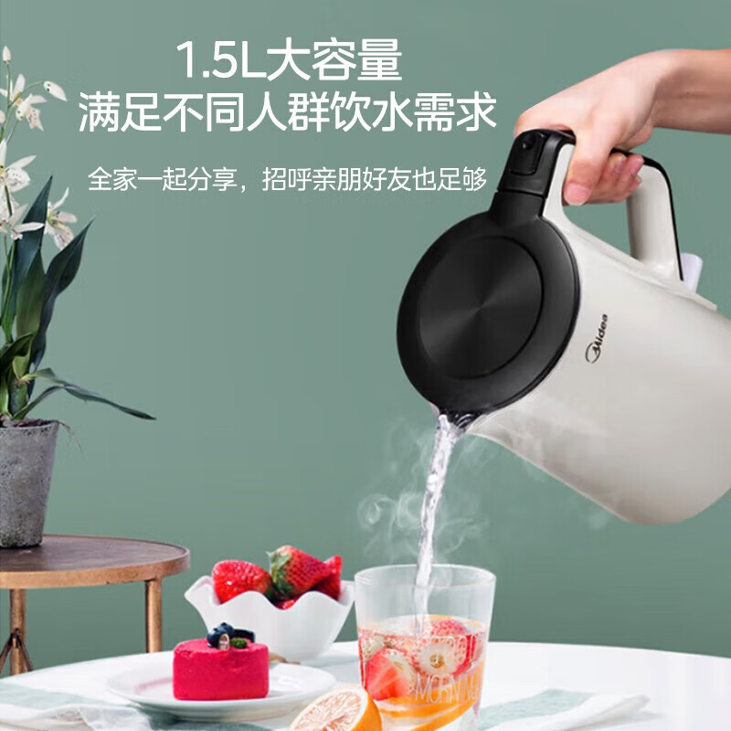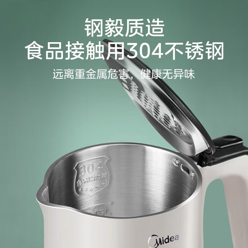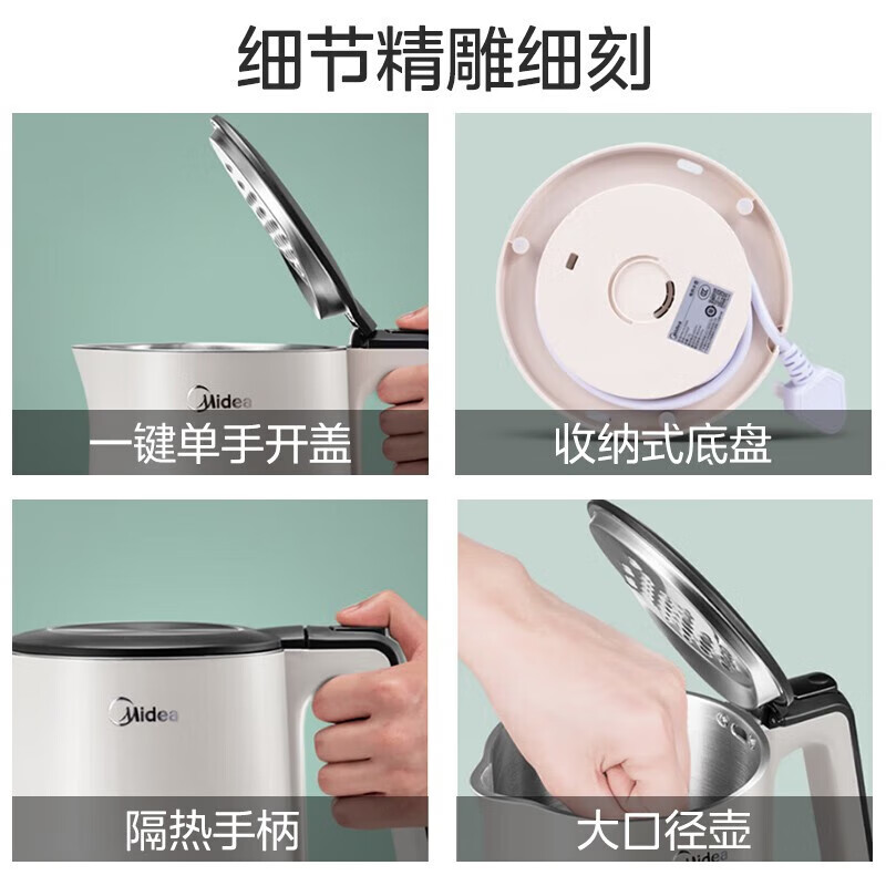 商品相册:美的(Midea)1.5升电水壶双层防烫一体式无缝304食品级不锈钢 HJ1522第
